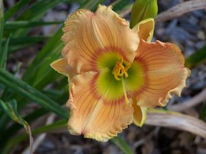 DAYLILY (HEMEROCALLIS)Hemerocallis 'Topguns Pleasant Surprise' - A lovely warm pastel golden orange blend, a lime green throat with a darker peach-red to orange-red halo between the two. The substance of the petals is very thick with attractive veining and ruffled edges. This is a beauty hybridized by B. Scott in 1996, 'Golden Scroll' x 'Wings of Chance'. It is very very slow to size up.