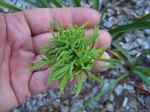 DAYLILY (HEMEROCALLIS)Hemerocallis 'Wigged Out' - An orange-rose blend with a yellow throat... that's when it flowers. Often it produces “prolifs”, greenish hairy growths which remind me of the daylily version of the Allium called 'Hair'! It is most unusual if not downright bizarre. And though probably of not much interest to many there are those collectors of the weird, rare and unusual out there... well, this is certainly a plant for you! And it would fit nicely into a garden featuring green flowers... to quote Judy Tenuta, "It could happen..."