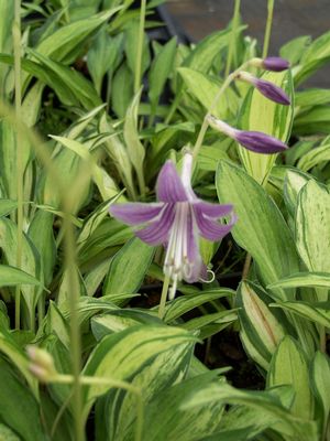 HOSTAHosta venusta ‘Masquerade’ (syn. ‘Variegata’) - This is a really dwarf plant, small enough for a trough with pretty purple flowers in summer. Foliage is dark green with cream yellow margins, very showy. Reversions do happen with this plant. Size: 4 inches x 6 inches, scapes: 8 inches.