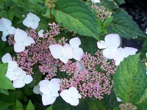 This species originates in the mountains of Japan and Korea. Though it is purportedly hardier than H. macrophylla we seldom see flowers in USDA zone 5b; as such we are listing all of the following cultivars as better doers in zones 6 to 9. The ovate to lanceolate foliage tends to be narrower than its close cousin, H. macrophylla. The smaller leaves support an over all more delicate appearance. And as with H. macrophylla there are also both lace caps and mop heads occurring in this species and will be noted below. We've seen this group also listed as H. macrophylla var. serrata. All prefer fertile soil to sandy loam. All of the following cultivars are cutting grown.