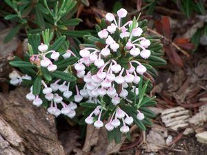 BROADLEAF EVERGREEN SHRUBSAndromeda glaucophylla 'Nana' – This a most handsome ericaceous evergreen with recurved narrow leathery dark gray-green leaves and pretty fat urn-shaped flowers, milk white and often flushed with pink in spring. Ours has never achieved the 18-inch height as is purportedly possible. Ours also acquires a bronze to purple-bronze winter coloration. And though it often burns a bit in winter in our gardens (and we attribute this to its siting) it recovers quickly in the spring. This is very similar to Bog Rosemary, Andromeda polifolia, with the main difference being that the flowers occur on shorter pedicels and its native range is entirely New World; otherwise the cultural requirements are as exacting: acid, peaty, sandy moisture retaining soil with a Ph of 4.5 to 5, planted in full sun to part shade. Resenting heat pockets site Bog Rosemary in cooler locations. Cutting grown.