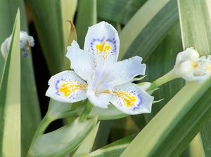 SHADE PERENNIALSIris japonica ‘Aphrodite’ – 'Aphrodite' is another beautiful variegated iris with ivory striped swords displayed in fans. 'Aphrodite' will be virtually evergreen in milder climates. Exquisite and delicate light blue iris flowers spotted yellow and orange at the base of the fringed falls. 'Aphrodite' is of clumping habit with moderate increase. In the fertile moist soils it demands it can be vigorous. But the I. japonicas are not the easiest Iris to please. This is an open to part shade loving iris. Established Iris, pot grown from division.