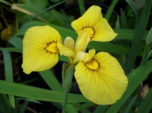 GRASSES & GRASS-LIKE PLANTSIris x pseudata 'Chance Beauty' – Gorgeous yellow iris flowers on tall stems in spring sport a reddish brown halo on each fall, the coloration etched in the veins reaches towards the outer edges of the falls as if a photo was snapped of the Mississippi Delta region from high above the stratosphere. The inner part of each fall between the halo and the standard is a slightly darker yellow than the outer part of each petal. Standards are short and a subtle creamy yellow. This is a sterile cross between I. ensata x pseudacorus with apparent hybrid vigor. Fans may reach a fantastic 4.5 feet and flower stems even taller! Site in full sun planted in fertile draining soil to even wetter, boggier conditions, 'Chance Beauty' is a quickly increasing perennial which would be equally at home used as a perennial garden beauty and as a large-scale ground cover or marginal plant. Division.