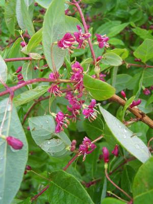 DECIDUOUS SHRUBSLonicera maximowiczii var. sachalinensis – The Sakhalin Honeysuckle is a handsome if not downright beautiful underutilized shrub that will make a good element in a wildlife planting or shrub border, a barrier hedge, screen or background to other shrubs and perennials. Dark red honeysuckle flowers in May become red berries later in the circadian calender. New leaves flush purple, expand, bronze and finally mature medium to dark semi-glossy green. The overall form is a rounded mounding shrub cloaked in clean-looking foliage all season on purple-brown stems. The Sakhalin Honeysuckle may also pick up very good yellow tones in the autumn. It has never set seed here and is not considered “invasive” in Connecticut. Site in full to half sun in almost any draining even alkaline soil; of course, a happier plant will be had if planted in better conditions. If purchased in our Autumn shipping window your Sakhalin Honeysuckle will be pruned with next year's performance in mind. Cutting grown.