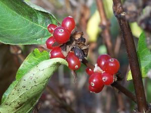 DECIDUOUS SHRUBSLonicera vesicaria DJH 123 (ex: Hinkley) - This shrub honeysuckle is a restricted endemic from Kaibang-san mountain in eastern Korea collected by Dan Hinkley in 1993. Bright yellow clusters of terminal flowers bloom in late spring over clean leathery moderately hirsute deep green obovate foliage. Large quarter-inch and larger showy red translucent berries cluster at branch tips in autumn. The bark exfoliates becoming increasingly shaggy and interesting. A handsome shrub planted with variegated Miscanthus or perhaps golden-foliaged conifers. Our original plant came cutting grown from the original Heronswood Nursery in Washington State. However, we have had no success from cuttings so we have been growing this unusual shrub honeysuckle from seed. In an interesting side note some leaves on a small number of our seed-raised progeny display from 3 to 5 shallow indentations barely suggesting lobes. And, Dan, if you’re exploring the wilds of the internet and run across this… please give us a call to tell us how it is you managed to reproduce this Honeysuckle from cuttings! Also, with the reputation that some honeysuckles have for being weedy we can report that L. vesicaria has not set seed in the display gardens at Quackin’ Grass in the decade plus length of time it has been in the landscape. Site in full to half sun planted in any decent well-drained garden soil. Seed grown.