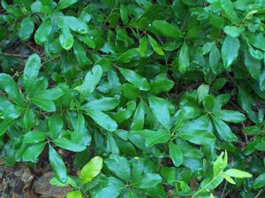 BROADLEAF EVERGREEN SHRUBSMorella (form. Myrica) pennsylvanica (MALE) – This is the Northern Bayberry or Candleberry. A shoreline shrub, low windswept colonies exhibit great salt and drought tolerance plus excellent deer resistance. Dark green semi-glossed leathery leaves are tongue-shaped, very aromatic when crushed. Of variable growth, deciduous or semi-evergreen, this tough suckering shrub will be taller with faster colonization in better soil and full sun forming a great barrier or screen. This is a dioecious species; as with hollies males and females must be present for fruit production. Cutting grown or division.