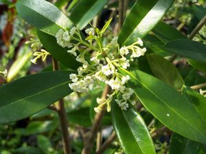 BROADLEAF EVERGREEN SHRUBSOsmanthus americanus – This is a remarkably beautiful broadleaf evergreen from southern coastal plain woodlands. A member of the Oleaceae there it may actually grow into a small tree; Wild Olive can certainly be pruned into one. Farther north simple large green leaves cover this wider than tall mounding shrub. Each leaf is a smooth, glossy and broad blade. On February 21, 2010 my good friend Russell Stafford and I stumbled upon a specimen at USDA zone 6 Arnold Arboretum growing in an open location in full sun; its leaves were as resplendent on that late date as they had been no doubt 6 months earlier. Therefore, Wild Olive appears to be hardier than many might construe based upon its native range. Small white flowers occur in spring. Up north site Osmanthus americanus in full sun planted in any moderately good garden soil that retains some moisture between rains. As we have not tested this wonderful broad leaf evergreen in USDA zone 5b we strongly recommend spring planting with winter protection for its initial 2 to 3 years in the full sun garden in the north or with the shelter of a south-facing wall. Supplemental water during droughts is important if sited in drier settings. Wild Olive may possibly grow to 10 feet or so in the north, but often 15 to 25 feet in its native south. However, there are wild specimens as tall as 40 feet. Cutting grown.
