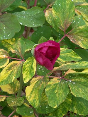SUN PERENNIALSPaeonia mlokosewitschii (?) ‘Pretty Molly’ – is a peony with a difference: The new stems erupt from the soil in coppery caramel-orange shade. As the leaves stretch and expand splashes and streaks of creamy yellow variegations emerge and brighten against the green backdrop. Single, somewhat ephemeral, hot pink peony flowers grace the stalks in late spring followed by large seed pods shaped like medieval jesters’ caps. These split open late season to reveal a brilliant crimson interior studded with plump round dark blueberry-like fruits that encapsulate pollinated seeds. ‘Pretty Molly’ is still rare in the trade. Site ‘Pretty Molly’ in part to full sun planted in fertile draining soil or sandy loam. We are now beginning to produce plants from sown seed; a fair percentage of the offspring are displaying very variegated foliage. Also, it has to be said that 'Pretty Molly' may very well be the gorgeous child of mixed parentage and not true P. mlokosewitschii. There are pink mlokos out there but as this is a real hot pink there is question as to whether, if she is straight mloko., that the genes that have induced the variegations on the foliage have also impressed their will upon flower color... or not?! In any scenario 'Pretty Molly' is pretty darned amazing. We may only have a few available annually until we can increase numbers. We only select and save the most variegated and discard the remainder so as to not water down her natrual beauty. Pot grown peony from seed or division.