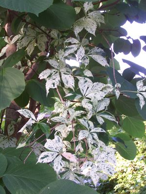 VINESParthenocissus quinquefolia ‘Variegata’ – This is a stable variegated form of Virginia Creeper. It is probably the very same clone called 'Star Sparkler'. Each compound palmate leaf is irregularly splashed with much cream, just beautiful as it lights up in part to open shade vining and twining all the way. The lack of chlorophyll has tamed this vine which in its straight green form can be very rambunctious! Greenish cream-yellow June/July flowers in cymes give way to blue fruits which when in contrast with the pink-infused late season foliage are striking. Climbing or sprawling this is a vine of great merit. Plant this variegated Virginia Creeper in fertile draining soils where it will demonstrate fair drought tolerance in part to open shade. Cutting grown.