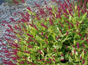 SUN PERENNIALSPersicaria amplexicaulis 'Golden Arrow' – Rich pink-red to dark crimson spikes arise in great numbers over clumps of bright golden-green lance-shaped leaves which may grow as long as 10 inches on a settled-in specimen. 'Golden Arrow' forms a rounded clump composed of the densely-set leaves and flowers. If you like accents of bright golden yellow set against other garden denizens, don't mind the pink-red contrast of the flowers and enjoy striking late season displays then what's stopping you?! The late summer to autumn flowering time on this Mountain Fleece make it a useful texture when planted with late blooming daylilies, shorter warm season grasses or any of the many daisy/aster flowers which occur in great abundance during this part of the growing season. 'Golden Arrow' would be striking with Eupatorium rugosum ‘Chocolate’. This is a low maintenance perennial of very easy disposition planted in any good soil sited in more sun than not. 'Golden Arrow' is easy, tough and demonstrates fantastic contrasting texture. It's a clumper. Division or cutting grown.
