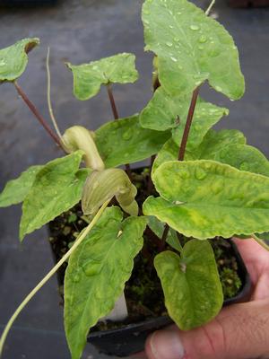 BULBSPinellia cordata – In moist shade this cute little Sweet Arum sports little deep dark purple and green-striped Jack-in-the-Pulpit flowers which emit a delicious fruity fragrance. A long spadix rather like a mouse tail arises out of the mouth of each spathe flower and stands erect. Sweet Arum blooms June and July. The elegant elongated arrowhead-shaped leaves are glossy dark green with distinctive lighter veining and rich deep purple undersides. It will gradually form a colony, reseeding where content. Late season look for little bulbils that form at the point where the pedicel conjoins the leaf. We find it to be a magnificent little aroid. Sweet Arum is a moderate increaser and will make a charming colony in time. If ordered in autumn it will arrived dormant, likely. Grown from bulbils.