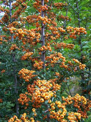 DECIDUOUS SHRUBSPyracantha x 'Teton' – 'Teton' is a fine hybrid Firethorn cloaked in dark green glossy leaves. Its habit is quite strong, vertical and relatively narrow. Flowers are plentiful – cream white in spring. The fruit set is heavy in a glorious golden orange tone. A customer complained the fruit is "dull orange". Yes, it settles at an orange tint. Still amazing. Berries are persistent. Another big plus is that 'Teton' demonstrates very good disease resistance to both scab and fireblight. Slow to 16 feet. Fertile, draining soil in full to half sun – better flowering and fruiting in more sun. For gardeners towards the northern end of its range spring planting is advised. Potted shrub, cutting grown.