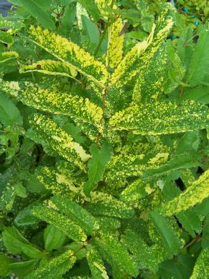 SUN PERENNIALSSanguisorba officinalis ‘Lemon Splash’ – It’s a mystery that ‘Lemon Splash’ is still relatively unknown. The foliage on this Burnet is striking. It is as if a mad artist dipped a brush in molten lemon rind then flicked the paint repeatedly at once green leaves. The speckles and splashes sparkle against a semi-glossed, dark green backdrop. The basal leaves are pinnate and large with as many as 25 oval, lightly scalloped leaflets. Leaf stems shorten as they approach the tips of main stalks. In late summer ‘Lemon Splash’ sports terminal clusters of rich blood red-maroon “hot dogs” approaching 1” long on short inflorescences. Though not significant the flowers are charming mixed with late season perennials providing good contrast – especially so in that so many of the late season flowers are composites such as Chrysanthemum ‘Venus’. ‘Lemon Splash’ is a tough, easy perennial in full to part sun planted in any good garden soil. Pot grown Division.