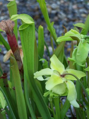 These are the fascinating Pitcher Plants. All are from eastern North America, most from Southeastern U.S. One species occurs in the north all the way up into Newfoundland in peat bogs, Sarracenia purpurea with USDA zone 4 hardiness... perhaps some populations hardy into zone 3. The spring and summer flowers which last for many weeks are as beautiful as they are fascinating. All species have evolved pitchers with passive pitfall traps… the insects enter but can’t back up due to downward facing hairs which disallow retreat. They are structurally curious and in their own unique way very beautiful. All require constantly moist to wet feet, boggy conditions suit them well or can be easily pot grown in 50% coarse sand to 50% peat mix. In a natural setting they can tolerate vernal flooding but for most of the year their crowns must be above the water line or they will rot… yes, I know: it’s hard to believe! Most of the literature tells you not to feed them and it is true that any chemical fertilizer should be avoided as these plants have little tolerance to salts. But you can use quarter strength fish emulsion on occasion and I mean only on occasion, not at every watering, and only during active growth. Potted plants must be re-potted every 2 years with a fresh mix of peat and coarse sand or they languish. They are easy to transplant and respond well to good treatment. Most prefer sun although I have found that S. purpurea seems particularly happy during the summer under the shade cloth in my greenhouse. That was a bit of a surprise as I’ve seen them growing in the bright open sunny conditions in the fantastic peat bogs of Nova Scotia. Generally I would say they need be planted in full sun in the north to to partly shaded exposure in the south. They make fascinating potted plants. All of the following are offered by division.