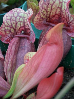 These are the fascinating Pitcher Plants. All are from eastern North America, most from Southeastern U.S. One species occurs in the north all the way up into Newfoundland in peat bogs, Sarracenia purpurea with USDA zone 4 hardiness... perhaps some populations hardy into zone 3. The spring and summer flowers which last for many weeks are as beautiful as they are fascinating. All species have evolved pitchers with passive pitfall traps… the insects enter but can’t back up due to downward facing hairs which disallow retreat. They are structurally curious and in their own unique way very beautiful. All require constantly moist to wet feet, boggy conditions suit them well or can be easily pot grown in 50% coarse sand to 50% peat mix. In a natural setting they can tolerate vernal flooding but for most of the year their crowns must be above the water line or they will rot… yes, I know: it’s hard to believe! Most of the literature tells you not to feed them and it is true that any chemical fertilizer should be avoided as these plants have little tolerance to salts. But you can use quarter strength fish emulsion on occasion and I mean only on occasion, not at every watering, and only during active growth. Potted plants must be re-potted every 2 years with a fresh mix of peat and coarse sand or they languish. They are easy to transplant and respond well to good treatment. Most prefer sun although I have found that S. purpurea seems particularly happy during the summer under the shade cloth in my greenhouse. That was a bit of a surprise as I’ve seen them growing in the bright open sunny conditions in the fantastic peat bogs of Nova Scotia. Generally I would say they need be planted in full sun in the north to to partly shaded exposure in the south. They make fascinating potted plants. All of the following are offered by division.