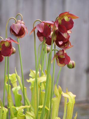 These are the fascinating Pitcher Plants. All are from eastern North America, most from Southeastern U.S. One species occurs in the north all the way up into Newfoundland in peat bogs, Sarracenia purpurea with USDA zone 4 hardiness... perhaps some populations hardy into zone 3. The spring and summer flowers which last for many weeks are as beautiful as they are fascinating. All species have evolved pitchers with passive pitfall traps… the insects enter but can’t back up due to downward facing hairs which disallow retreat. They are structurally curious and in their own unique way very beautiful. All require constantly moist to wet feet, boggy conditions suit them well or can be easily pot grown in 50% coarse sand to 50% peat mix. In a natural setting they can tolerate vernal flooding but for most of the year their crowns must be above the water line or they will rot… yes, I know: it’s hard to believe! Most of the literature tells you not to feed them and it is true that any chemical fertilizer should be avoided as these plants have little tolerance to salts. But you can use quarter strength fish emulsion on occasion and I mean only on occasion, not at every watering, and only during active growth. Potted plants must be re-potted every 2 years with a fresh mix of peat and coarse sand or they languish. They are easy to transplant and respond well to good treatment. Most prefer sun although I have found that S. purpurea seems particularly happy during the summer under the shade cloth in my greenhouse. That was a bit of a surprise as I’ve seen them growing in the bright open sunny conditions in the fantastic peat bogs of Nova Scotia. Generally I would say they need be planted in full sun in the north to to partly shaded exposure in the south. They make fascinating potted plants. All of the following are offered by division.