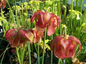 These are the fascinating Pitcher Plants. All are from eastern North America, most from Southeastern U.S. One species occurs in the north all the way up into Newfoundland in peat bogs, Sarracenia purpurea with USDA zone 4 hardiness... perhaps some populations hardy into zone 3. The spring and summer flowers which last for many weeks are as beautiful as they are fascinating. All species have evolved pitchers with passive pitfall traps… the insects enter but can’t back up due to downward facing hairs which disallow retreat. They are structurally curious and in their own unique way very beautiful. All require constantly moist to wet feet, boggy conditions suit them well or can be easily pot grown in 50% coarse sand to 50% peat mix. In a natural setting they can tolerate vernal flooding but for most of the year their crowns must be above the water line or they will rot… yes, I know: it’s hard to believe! Most of the literature tells you not to feed them and it is true that any chemical fertilizer should be avoided as these plants have little tolerance to salts. But you can use quarter strength fish emulsion on occasion and I mean only on occasion, not at every watering, and only during active growth. Potted plants must be re-potted every 2 years with a fresh mix of peat and coarse sand or they languish. They are easy to transplant and respond well to good treatment. Most prefer sun although I have found that S. purpurea seems particularly happy during the summer under the shade cloth in my greenhouse. That was a bit of a surprise as I’ve seen them growing in the bright open sunny conditions in the fantastic peat bogs of Nova Scotia. Generally I would say they need be planted in full sun in the north to to partly shaded exposure in the south. They make fascinating potted plants. All of the following are offered by division.