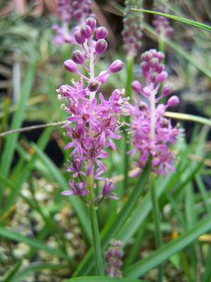 ARID LAND PLANTSBarnardia numidica (syn. Scilla numidica) – The Fall Squill produces lavender-pink feathery spikes late summer/early fall. The emerging spring foliage is quite beautiful: red to pink overlays on glossy green, heavy textured strap-shaped blades which age to bronze and finally green. The leaves die down by late spring/early summer. It is summer dormant only re-emerging late in the growing season. Though Barnardia numidica looks very much like the Japanese Barnardia japonica, a close cousin, Fall Squill from North Africa is a bit larger in all respects. Site Fall Squill in full blazing sun planted in a well-draining mix amended with grit and a handful of lime. Good drainage is essential for this otherwise easy-going bulb. Fall Squill increases moderately fast. Grown from bulbils.And it can self-sow. Various sized bulbs/bulbils in each pot.