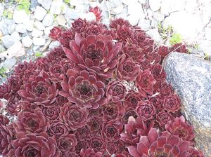 ARID LAND PLANTSSempervivum ‘Pacific Red Rose’ – This is another beauty with relatively large rosettes of purple-red infused with just a bit of olive. The newest growth in the center of each rosette remains quite dark red. When the temperatures cool this form of Hens and Chicks turns a gorgeous deep dark burgundy red. This cultivar is much commented about and requested here at Quackin’ Grass when folks see it in the rock garden. Site in full sun planted in well-drained soil to a lean, gritty mix. 'Pacific Red Rose' is moderately slow to increase and does so in a clumping fashion. Grown from offsets or “chicks”.