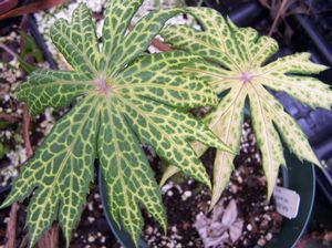 SHADE PERENNIALSSyneilesis palmata ‘Kikko’ – is reticulate variegated form of Shredded Umbrella Plant (Geez, do I ever dislike that common name!) The fuzzy peltate leaves expand into deeply cut lobes within a rounded outline. The glowing cream yellow leaves light the shade garden gradually become greener as the season progresses. The aster-like flowers in summer are not nearly as interesting as the leaves, however, Syneilesis palmata ‘Kikko’ does bloom in midsummer when most all woodlanders have already had their day in the shade. But we grow it for the exceptional bold foliage. This marvelous clumping perennial will settle happily into dry summer shade. This form was selected in Japan. Division.