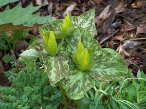 SHADE PERENNIALSTrillium luteum – The Yellow Trillium has numerous synonyms which include the moniker “luteum” or “flavum”. The upright spatulate petals, each about 1” tall, are a yellow-green rising up from the center of lovely mottled leaves with green, bronzy brown and maroon-brown in the mix. Each leaflet may attain 6” in length. T. luteum flowers mid to late spring emitting a faint lemon fragrance. Russell Graham informs us that there is confusion among some of the plants listed in this species "as every or very nearly every maroon species has a yellow form AND there are maroon forms of luteum...At least that is the current situation." Trillium may arrive bare root or potted.