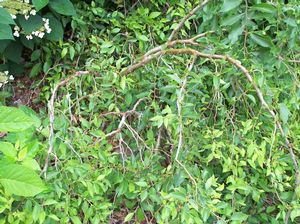 TREESUlmus pumila ‘Dwarf Weeper’ – This is a strictly weeping plant, at least it has been for us. This form of the Siberian Elm may possibly do some mounding but if you desire a more vertical posture to achieve a wanted height, stake it; then when it has achieved the height you desire let it do what it does best: cascade. The winter form of this small tree is fascinating with gnarled, crooked wood and gently zigzagging branchlets surrounded by a pale brown bark with warm tan lenticels. The bark exudes a white gold color with a silvery sheen which captures and reflects light. Blackish brown globose buds expand in early spring. Clustered flowers stud the stems – more fascinating than beautiful. Rounded elm seeds follow which do modestly decorate the tree. Leaves may become golden brown in some autumns. This would make an interesting choice for an embankment or as a forward ground covering plant to taller background shrubs and evergreens in a larger landscape. 'Dwarf Weeper' might be an interesting bonsai candidate. It may be staked and trained up to a 7-foot specimen. Ulmus pumila ‘Dwarf Weeper’ tolerates tough conditions. Cutting grown.
