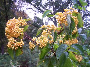 DECIDUOUS SHRUBSViburnum dilatatum ‘Michael Dodge’ – Bearing large, light yellow fruit clusters in contrast to the all other V. dilatatum selections which display red berries 'Michael Dodge' is exceptional. When the yellow fruit is set against the russet orange fall color it is not only fall, it is quintessential autumn! It's downright rutilant! Okay, okay - I had no clue this word even existed until a friend of ours, Deborah B. ran across it and delightedly shared her new-found vocabulary stumper with us. In winter we have seen chickadees, cardinals and titmice, white-throated, song and chipping sparrows devouring the fruits when food has become scarce; it may be that the berries become more palatable after bletting. Plant it in near proximity to 'Erie' or another V. dilatatum selection or V. erosum for its copious late season berries. In any scenario 'Michael Dodge' is an important element in our winter garden... Viburnum dilatatum 'Erie', too. The species is from Eastern Asia. 'Michael Dodge' is of garden origin - and a beauty at that. This came to from Michael Dodge, the creator of this wonderful Viburnum, “Hello I noticed you list my Viburnum dilatatum 'Michael Dodge'. FYI: this was a deliberate cross I made at Winterthur Gardens in Delaware while working there. I took the pollen of a good selection of V. dilatatum and pollenated V. dilatatum 'Xanthocarpum' - a small fruited yellow cultivar. The resulting seeds / seedlings produced red / orange fruit and Winterthur selected the best and named it after me as I was the progenitor! The rest were sold to local nurserymen I believe.”