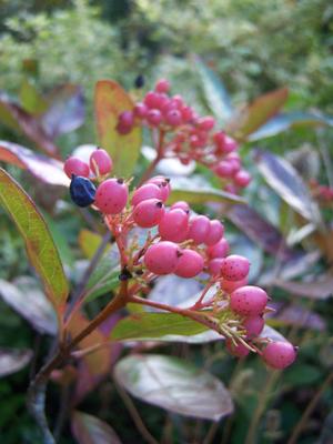 DECIDUOUS SHRUBSViburnum nudum ‘Winterthur’ – The Smooth Witherod is closely related to V. cassinoides. This improved selection from Winterthur Gardens in Delaware has glossy tongues of foliage turning red-purple in autumn. Rounded white cymes occur in mid-spring. The fruit set is spectacular when associated with another V. nudum cultivar. A single berry will go through the following changes: medium glossy green – light pearly whitish-green – pink – lavender – blue and finally purple-black. Often the many different color incarnations occur simultaneously for a spectacular late season show. This is a smaller growing viburnum that would work well as a component in a smaller garden. The species comes from Connecticut, Long Island to Florida, west to Kentucky and Louisiana.