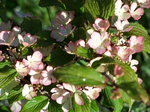 DECIDUOUS SHRUBSViburnum plicatum f. tomentosum ‘Molly Schroeder’ – 'Molly Schroeder' is a consistently pink flowering lace cap form of Doublefile Viburnum. It demonstrates some free-flowering recurrence after the main spring flush. Similar in look to 'Pink Beauty' but shorter in youth, shorter for years... they're both lovely. Typical good fall color and bejewled red fruit sets upon the corymbs complete the picture.