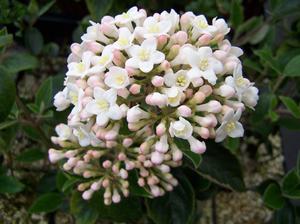 DECIDUOUS SHRUBSViburnum x burkwoodii 'Chenaultii' - This very floriferous shrub smothers itself in fragrant white snowballs April or May depending upon where you garden. 'Chenaultii is overall a tighter, denser, slower and more dwarf, rounded in outline. The foliage, too, tends to be a bit smaller than other Burkwood hybrids lasting longer into the autumn when they pick up orange to scarlet, rich red to bronze colors - some years in a mix. Many leaves remained on the shrub throughout the winter of 2013 in a dusky chocolate-bronze shade. The rounded stature of the 'Chenaultii' is much shorter and more compact than other x burkwooii selections, only growing to about 5 or so feet. Michael Dirr says that 'Chenaultii' is "an extremely confused entity". But it is nevertheless a beautiful shrub flowering slightly later than other V. x burkwoodii cultivars worthy of a spot in your landscape.