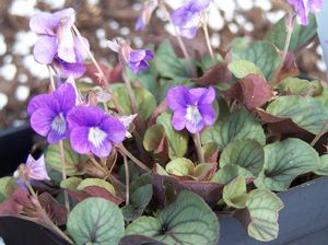 SHADE PERENNIALSViola walteri 'Silver Gem' (ex: Jonathan Lehrer) - A lovely mat-forming to slightly mounding violet with silvery foliage nicely demarcated with green veining. Though generally not much seen leaf undersides are a deep, rich purple. However, some leaves do cup offering glimpses of the beautiful, contrasting purple. Early in the growing season typical violet-blue flowers rise above the silvery leaves. This perennial can bloom repeatedly with successive flowering into the autumn. It is a dense, neat and tidy grower introduced by Mt. Cuba Center in northern Delaware. Best planted in fertile soil in full to part shade. Often found growing in calcareous conditions the addition of dolomitic limestone may be helpful. The species ranges from Florida to Texas, north to West Virginia, into southern Ohio, Kentucky and Arkansas. 'Silver Gem' has good drought tolerance once established. Pot grown Division.