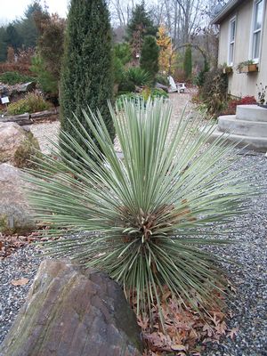 ARID LAND PLANTSYucca glauca – Some years ago I wrote an article for the Connecticut Cactus and Succulent Society and discussed this marvelous Adam’s Needle; this says it all: "Yucca glauca is a four season wonder. In 7 years the multitudes of long narrow gray green leaves, 24” to 30” but only .33” to .5” inch wide, edged strongly in silver-white extend from a thick central trunk. The form of the plant, looking like a giant sea urchin, is an upright dome about 3’ across and nearly as tall with the leaves tightly, almost predictably spaced, evenly within the hemispherical outline. Adam’s Needle, referring to the sharp point at the end of each blade, just gets better and better in time. Though its fragrant 2.5” inch purple-tinged greenish white rounded flowers on spikes up to 12’ tall have yet to debut its remarkable evergreen form has added such a strong interest in all seasons that I would be happy with it as just a foliage plant. Most of us are familiar with Yucca filamentosa and look down our noses at it with the attitude that it is “too common”. But Y. glauca raises the bar – it is so beautifully structured and refined. I cannot understand why it is not more used by gardeners in the east as it is hardy to USDA zone 4. It is a great contrast to the larger growing Opuntia phaeacantha color forms and is striking set among boulders. In time Yucca glauca raises its exceptional architectural foliage upon a slowly rising trunk as if on a slow motion lift. We've observed downy woodpeckers, arrays of goldfinches and common yellowthroats picking and pecking on the main flower stalks, flowers and pedicels picking at... well, as the structures tower over our heads we're not sure! As for the woodpeckers the tall stalk may be merely an attractive, convenient perch." Adam's needle has since flowered here on several occasions; it is striking, dramatic and oh so very tall! Site Adam’s Needle in full blazing sun planted in well-drained soil to which lime has been added. Seed grown.