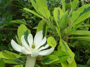 TREESMagnolia virginiana Mattie Mae Smith' - is a beautiful variegated glossy-leaved form of Sweetbay Magnolia with typical fragrant summer flowers. Showy leaves are narrow tongues about 4 to 5 inches long with irregular broad yellow margins. Creamy flowers occur once the tree has attained some size and girth. It is likely to be evergreen in warmer climes. Plant in deep, fertile and moist loam in part shade. Some winter protection from the west and north zephyrs will keep 'Mattie Mae Smith' looking proper. Northern gardeners: please purchase and plant only in spring.