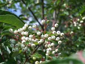 DECIDUOUS SHRUBSCornus racemosa - Gray Dogwood is native for us in northeastern Connecticut. White flattened cymes from 1.5 to 2.5 inches diameter give way to white fruits on juicy red pedicels. The berries sport a black spot at the apex where petals once ruled. Autumn leaf color is bronze to red-maroon. Winter interest isn't bad: second and third-year wood is and earthy chalk red; first year twiglets are deep, glossy ruby. Nice! Gray Dogwood is useful as a wildlife plant, in a larger, mixed wildlife hedgerow or allowed to colonize near a stand of tall trees where it will form an attractive thicket. Cornus racemosa feeds the birds and will provide safe sanctuary for a number of bird species that nest closer to the ground. Fertile soil. Sun will likely encourage shorter, denser and more floriferous shrubs that will develop nicer autumn leaf color. Gray Dogwood isn't a dog... so to speak and affords really good autumn interest, attractive in all other seasons. It is certainly underutilized and worthy of consideration. Gray Dogwood's nativity is from Maine to Ontario/Minnesota, south to Georgia and Nebraska. Cutting grown.