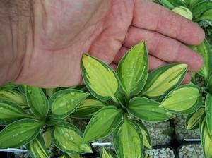 Hosta. Hosta is a staple for shade gardeners. Hostas prefer open to dappled shade conditions. Early morning or late day sun is generally acceptable. The exception to the rule (and it seems in the plant world there is always at least one exception to the rule!) is Hosta plantaginea which requires more sun for flowering to occur. Hostas can fill a midsummer’s day dream with spikes of lavender, purple and white blossoms, some fragrant. There are growers and collectors who dislike hosta flowers though I find this a curious affectation; I am personally grateful for perennials of easy disposition that so readily bloom, carefree, adorning and lighting the woodland garden during a period that might otherwise be a flowerless void. Flower your garden! Dig in. Have fun. Hostas prefer fertile draining soil with many demonstrating moderate drought tolerance once established. Many of the following are offered as pot-grown divisions of our stock plants. Others are from tissue culture. For Hosta there are several different size charts available that can be found on line with some digging. Of course, some plants straddle these arbitrary determinations. We are using the following classification...