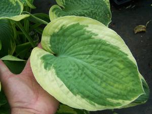 HOSTAHosta 'Olive Bailey Langdon' - Dark blue green leaf centers are haloed with a gold edge. Leaves are heavily corrugated and of thick texture. Nearly white flowers appear in late spring/early summer densely set on scapes to 30 inches.