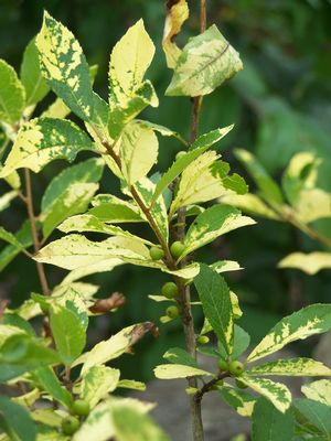 DECIDUOUS SHRUBSIlex verticillata 'Sunsplash' - Discovered at Broken Arrow Nursery this female form of Winterberry has all foliage splashed, spotted and streaked in bright yellow. Fruits are small and scarlet... there are better berrying forms but none sport variegated leaves! This selection has not only been slower growing but has also remained shorter in the gardens at Quackin' Grass. Full to mostly sunny sites in fertile, moisture retaining soil. Cutting grown.