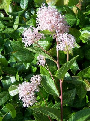 DECIDUOUS SHRUBSCeanothus x pallidus 'Marie Simon' – 'Marie Simon' is a C. x delilianus and C. ovatus cross with lovely pink ocean spray flowers in late spring with modest recurrent bloom through the summer into the fall. Pleasantly fragrant flowers are approximately 3 inches in diameter. Red stems are showy in winter. This New Jersey Tea, actually an east-west coast hybrid, is rounded and mounding. And 'Marie Simon' is semi-evergreen – we suspect more so in the more southerly growing regions. Adaptable to soil type and sun / shade mix Ceanothus x pallidus 'Marie Simon' is a work horse among shrubs that will simultaneously delight and stump your gardening friends. Not very well known but really is lovely. Full to part sun in fertile to dryish soils. For gardeners at the northern end of its range spring planting is advised. Established potted shrub, cutting grown.
