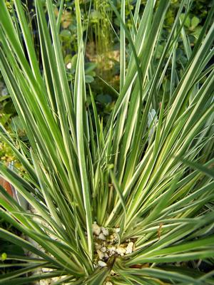 GRASSES & GRASS-LIKE PLANTSAcorus gramineus 'Himenasumene' - Miniature Variegated Sweet Flag displays fans of grassy blades with a showy longitudinal creamy yellow stripe complementing its dark green other half upon emergence. The yellow becomes milk white as the foliage fans mature. Plant it as a marginal, in a container with other smaller growing ornamentals, a terrarium, railroad garden, rock garden, or as an edging plant in fertile soil sited in part to full sun. Clumping. Established Dwarf Sweet Flag via division.