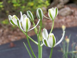 BULBSAlbuca fastigiata subsp. floribunda (ex: Seneca Hill Perennials) - From high in the Drakensberg from an altitude of 7,800 feet comes this comely Albuca. A sturdy flowering stem shoots up from quite vertical cylindrical almost Allium-like leaves which splay out to create an overall vase shape in green to gray-green. The gumdrop-shaped bud opens from bottom to top with pretty white cupped flowers. The reverse of each tepal is margined in white with a strong green central stripe. Ellen Hornig grew these from seed collected on Sentinel Peak. Hardiness is as of yet undetermined. But it is very easy in pots. Sun. Summer moisture, drier in winter. Clumping. These are potted.