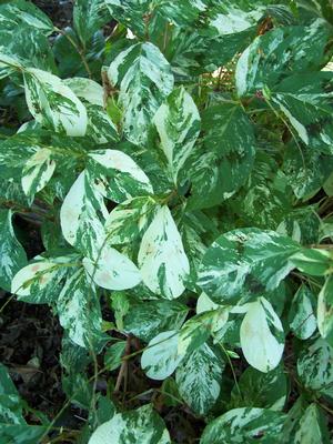 SHADE PERENNIALSPersicaria virginiana var. filiformis 'Painter's Palette' - Yeah, yeah. I know, I know... now get OVER yourself AND the snarling snob living within you and let me explain why I believe this to be a most worthy shade to semi-shade plant for your consideration... The leaves are simply gorgeous. And in shade where they are especially beautiful with all of those irregular creamy to white markings they illuminate otherwise potentially dead, receding dark green sections filled with gloom! Gloom, I tell you. GLOOM!!! Late season arching spires many inches long support tiny rice-grain florets which en masse are pretty like a Perseid Meteor Shower in red above the green and white leaves with violet-purple chevrons in evidence. Lovely! It's easy to satisfy and problem-free in average to fertile soil. It's a damned sight better than the noxious weeds that will readily swamp that somewhat over-looked shady spot at the edges of your shade garden. If it self-sows (and if happy it will) unwanted volunteers are easily pulled up and can be discarded on your compost heap... Now, aren't you just a little ashamed of yourselves, hmm???? The species, Persicaria virginiana, occurs over all of the eastern half of North America. Where 'Painter's Palette' was found and named we do not know. Open, dappled to part shade this is a perennial if sited in moist, fertile ground will tolerate nearly full sun. Established potted plants from cuttings or seed grown made / selected from our most variegated individuals. So, just do it! And if your garden clubbers come by just feign ignorance and exclaim, "Oh my God! I don't know how they got there... where did they come from???" while you secretly chortle within. Heh, heh, heh, heh, heh.