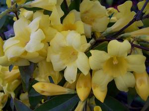 VINESGelsemium sempervirens – Evening Trumpetflower is a climbing, twining vine with bright yellow solitary (sometimes in cymes) funnel-shaped flowers each 1.5” long by 1” wide. Gelsemium sempervirens is May flowering in northeastern Connecticut. It is very showy and fast growing. The leaves are semi-glossy lances shading to a red-purple in autumn. This interesting vine holds onto its leaves and is evergreen in warmer climes; at the northern end of the range its tendency is to be more deciduous. We are getting this lovely vine to survive even in our rigorous USDA zone 5b climate by having planted it on the south side of our home. In the tough winter of 2009 when we experienced three nights into the lower minus teens Gelsemium sempervirens mostly died to the ground but rebounded with vigor during that summer. It even flowered from one of the stems that survived that very cold winter (which should tell you that it blooms on 2nd year or “old” wood). By the middle of that growing season it had recovered entirely. In the north spring planting is strongly advised. Cutting grown.