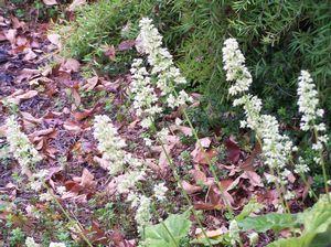 SHADE PERENNIALSHeuchera villosa ‘Autumn Bride’ – Multitudes of green felted maple-like leaves within a domed form look fresh and clean all season long. White spires like tall, narrow bottle brushes arise and flower September into October. This is a selection of the straight species which hales from southeastern parts of the U. S. It has deer resistance, drought tolerance, hardiness, withstands hot muggy climates and is simply a terrific late blooming perennial. H. villosa is also much in the focus as one of the parents to increase the palette of hybrid plants with a broad spectrum of foliage colors and sizes. This tough selection won’t melt down in the summer humidity and heat along the eastern seaboard of the U.S. Site in open shade to part sun as do so many Coral Bells. Plant ‘Autumn Bride’ in well-drained woodland conditions or average garden soil. Heuchera villosa is clumping with gradual increase. Established potted perennial by division.
