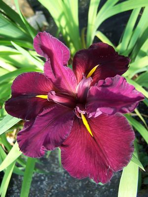 GRASSES & GRASS-LIKE PLANTSIris x louisiana 'Red Velvet Elvis' - Dark ruby-red falls with a small bright golden orange signal near the base of each petal are accompanied with mauve-purple frilled standards and nearly black style arms. 'Red Velvet Elvis' is one juicy flower color combo! Bred by Kevin Vaughn in Oregon this incredible Louisiana hybrid is deservedly an award winner (DeBallion, 2005). Site in full sun planted in moist soil to even a marginal pond setting. This stunning hybrid Louisiana Iris is of clumping habit with moderate to moderately quick increase. Division.