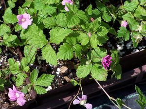 DECIDUOUS SHRUBSRubus arcticus – This is the tiny Arctic Bramble, sometimes called the Arctic Raspberry and Arctic Bramble. This delightful little sub-shrub forms pink raspberry flowers. When fertilized with a different clone Arctic Bramble produces beautiful little glossy red raspberries that are, so I am told, very tasty for birds and man alike, though it would require a lot of these small fruits to satisfy an appetite. We are told they dangle from stems like red and ruby jewels. We're attempting to locate a different clone from the one in our possession although curiously a few of our plants did develop raspberries in 2015 and 16. Cross-pollination with another Rubus specie? Some self-pollinating tendencies?? We don't know! But the little fruits were gem-like, surprising and welcome. The wrinkled usually trifoliate leaves complete with serrated rounded lobes emerge bronze and mature semi-glossed green. Site in part to full sun planted in fertile draining soil. Arctic Bramble is a slowly expanding and clumping plant. I have not been able to find the hardiness zones for the Arctic Bramble but I’m going to take a stab at USDA zones 2 to 6, perhaps into zone 7. Rubus arcticus is circumpolar to north temperate, found in many countries. Established potted Arctic Bramble by division.