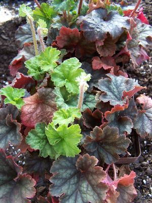 SHADE PERENNIALSTellima grandiflora‘Forest Frost’ – Fringe Cups are a monotypic genus related to Tiarella and Mitella; in fact, Tellima is an anagram of Mitella. 'Forest Frost' is a well-behaved clumping perennial with the cluster of hairy leaves generally growing up to 6" by 12" wide. The flowers on hairy stems to 32” are bell-shaped and fringed – usually green and white, with a touch of pink or purple-red in the florets, these colors increasing as the flowers age. But it is for the foliage that we grow it. The broad scalloped leaves, attractive and virtually evergreen here in USDA zone 5b, do resemble coarse Heuchera (Coral Bells) foliage. They pick up some beautiful bright crimson to purple highlights when the weather turns cold. Haling from stream banks and moist forest in the Pacific Northwest they enjoy fertile woodland soil in sited in open shade to part sun. For gardeners towards the northern end of its range spring planting is advised. Pot grown division.