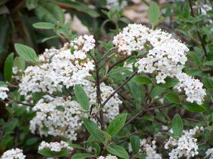 BROADLEAF EVERGREEN SHRUBSViburnum x burkwoodii ‘Conoy’ – This hybrid with V. utile (Service Viburnum) in its parentage is low-growing and mounding, wider in spread than in height. The rich green lacquer-finished obovate leaves have a pale bluish underside. They turn deep dark glossy maroon in the fall. As the autumn progresses in USDA zone 5b the outermost leaves acquire a lacquered bronze to black finish while the interior leaves remain a dark lime green. Creamy white flowers are 2” to 2.5” diameter followed by glossy egg-shaped red drupes that mature black. Regarding USDA hardiness: Though many sources indicate zone 5 hardiness in our experience we think that better success will be had in the warmer part of zone 5 (5b). 'Conoy' may settle in happily in 5a but we believe a sheltered spot in plenty of winter sun will increase chances of viability. This is a plant of great merit that will remain evergreen in warmer climes. ‘Conoy’ is small enough for a foundation garden or used as a front-of-the-border shrub facing down taller plants. A National Arboretum intro.