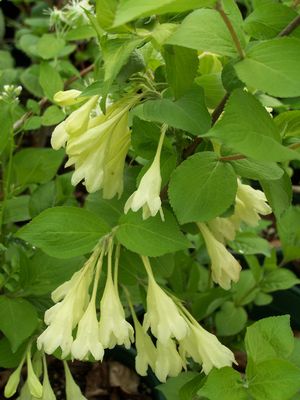 "Weigela subsessilis ‘Canary’ (registered 1996 AABGA) – A selection made from among a number of collections from various locales in South Korea obtained through Chollipo Arboretum. Approximately 300 plants were grown to obtain this pure lemon-yellow flowered clone. The typical species opens light yellow and quickly changes to brick-red. This clone was named for its persistent soft yellow color. It blooms with yellow magnolia cultivars."