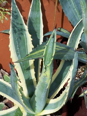 TENDER PERENNIALSAgave americana 'Marginata' (ex: Jonathan Lehrer) - Beautiful succulent with blue-gray leaves broadly margined in creamy yellow. Dark brown spines along the leaf margins and one at the tip - gets me every time! Makes a great potted plant in the north... Were it that we could grow this outdoors. Sigh. It will remain smaller in a container than it would planted in the ground. Draining soil with some fertility and added lime in plenty of sun. Keep it drier in winter. Why aren't more folks growing these??? ...They're incredible! For gardeners towards the northern end of its range spring planting is advised. Pot grown offset.