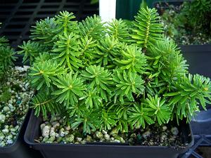 BROADLEAF EVERGREEN SHRUBSAbies koreana 'Gus' (aff. 'Cis') - A miniature Korean Fir in the form of a green and silvery mound eventually wider than tall. This was a selection named for Gus Mehlquist of UCONN rhododendron breeding fame. He would not have named it for himself as he railed against the shorthand for his full name, Gustav. This has never been introduced into the trade. Will grow 6 to 8 inches tall by 8 to 12 inches across in 10 to 12 years. Perfect in the rock garden, small enough for a larger trough, conifer collection, railroad garden, a heath or any spot your heart desires and upon which your aesthetic sense insists. Definitely, 'Gus' is extremely rare and a collector plant for conifer enthusiasts. Probably best somewhat sheltered from drying winds. Fertile, organic soil that holds moisture between rains exposure in part to full sun. Established potted shrub, cutting grown. Please read the Genus Overview below.